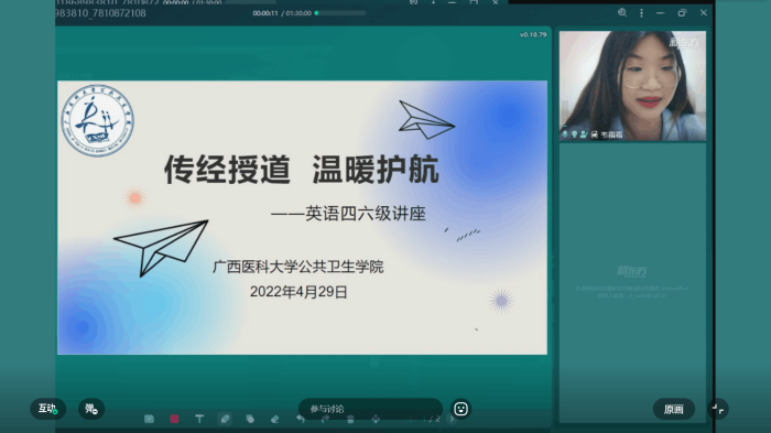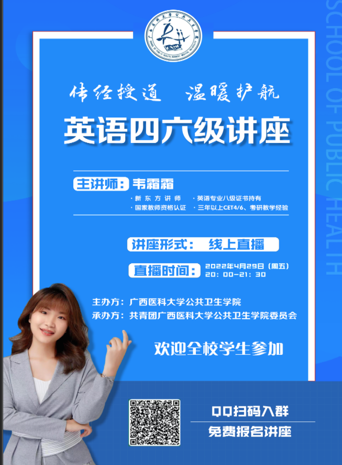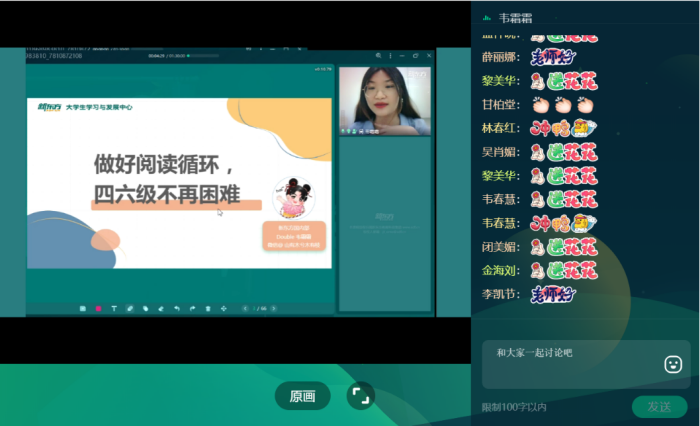 当前位置:学生工作为提升大学生英语四六级通过率,帮助报考同学更科学有效地备考。2022年4月29日晚,电子百家乐论坛 通过线上直播的方式举办 “传经授道,温暖护航”英语四六级讲座,面向全校学生。我院特邀新东方韦霜霜老师担任本次讲座的主讲人,全校接近200名学生参加了本次讲座。