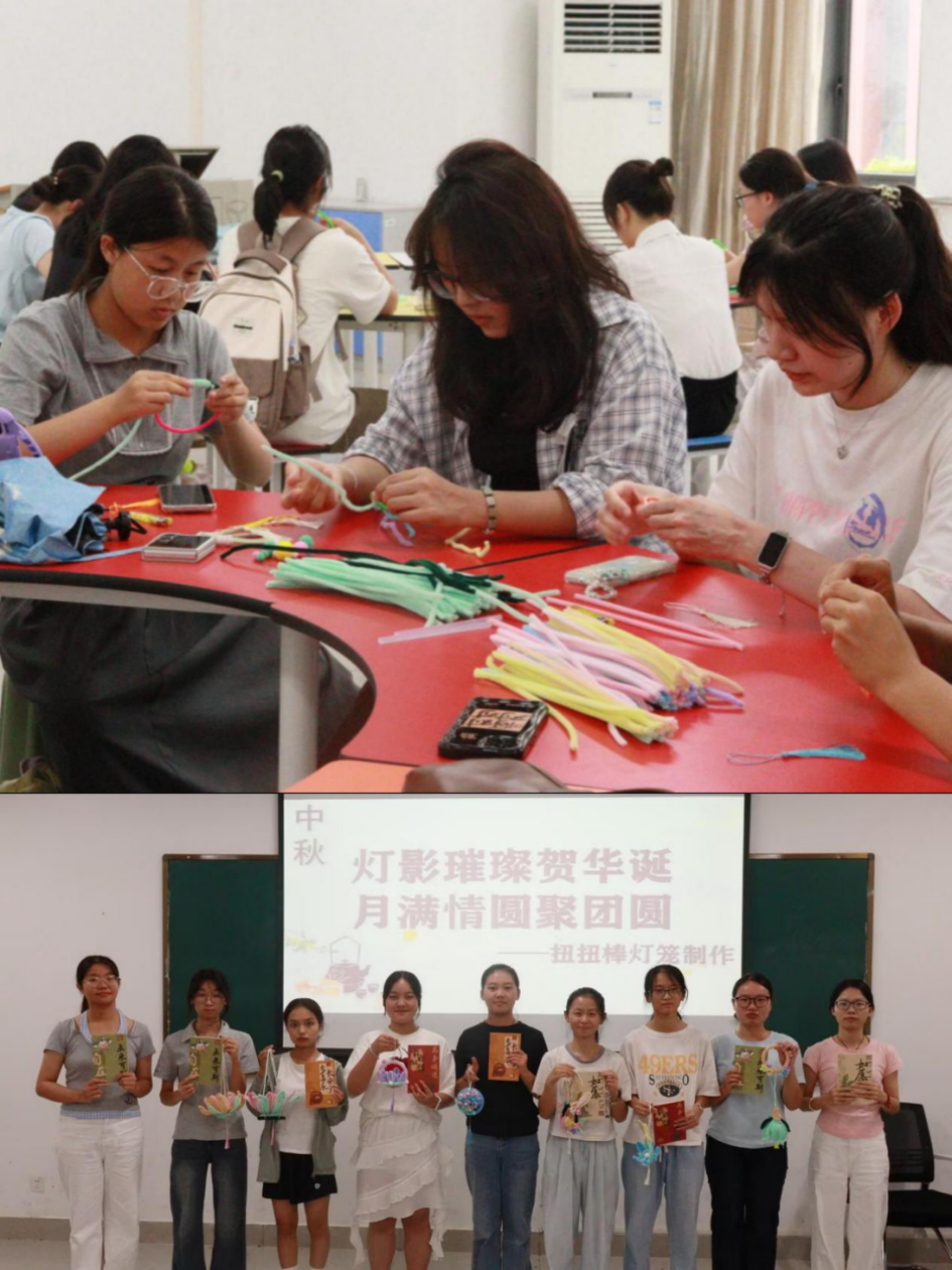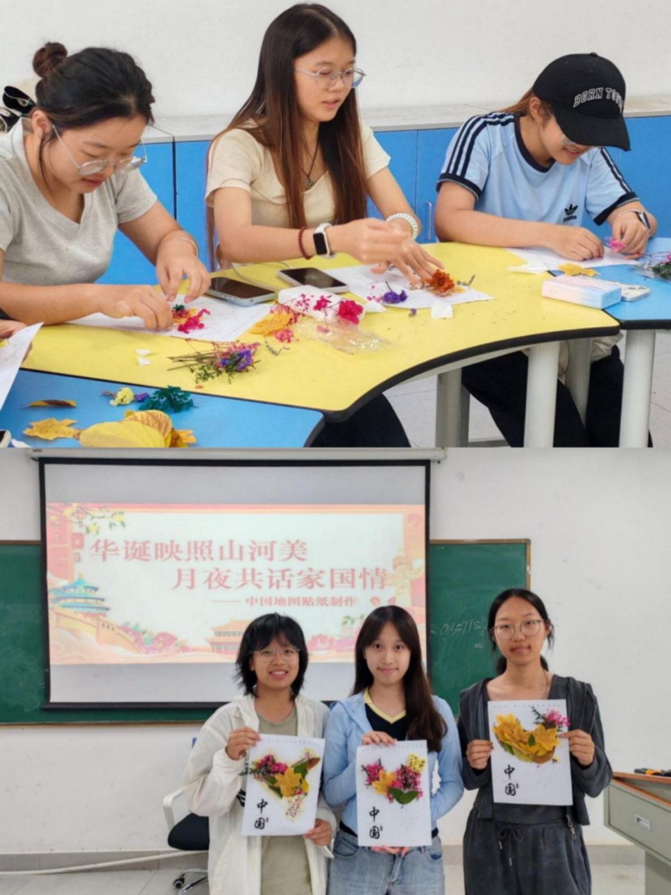 活动精心设计四大特色环节,融文化传承、心理调适、感恩教育与家国情怀于一体。在“灯影绘月,巧手传情”环节,同学们亲手制作中秋灯笼,通过扭、弯、缠等手法感受非遗魅力,在指尖流转中感悟传统工艺的智慧与雅致,进一步增强文化认同与自信。“以花为笔,绘就家国情怀”环节则引导学子以花、叶为媒,拼贴出祖国版图,让深沉的家国情怀在创作中自然流淌,传递对祖国的挚爱与礼赞。为帮助学生舒缓身心,“指尖揉‘月’,黏土凝‘心’”环节提供了心理调适空间。同学们围坐创作,在专注中舒缓情绪,强化感恩意识,提升心理调适能力。知识竞答环节将活动推向高潮,学子们在踊跃参与中深化对传统节日与爱国精神的理解,展现出公卫学子扎实的学识素养和炙热的家国担当。