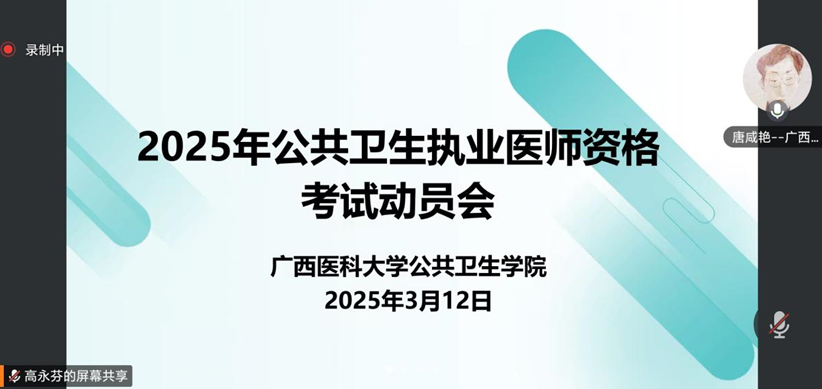 当前位置:要闻动态为深入贯彻落实国家卫生健康人才发展战略,帮助预防医学专业毕业生明确职业发展方向,提升执业医师资格考试通过率,3月12日,百家乐论坛 在线上召开2025年公共卫生执业医师资格考试动员会。百家乐论坛 副院长唐咸艳、教研科科长李少军、备考指导组老师高永芬及2025年公卫执业医考生参加会议。